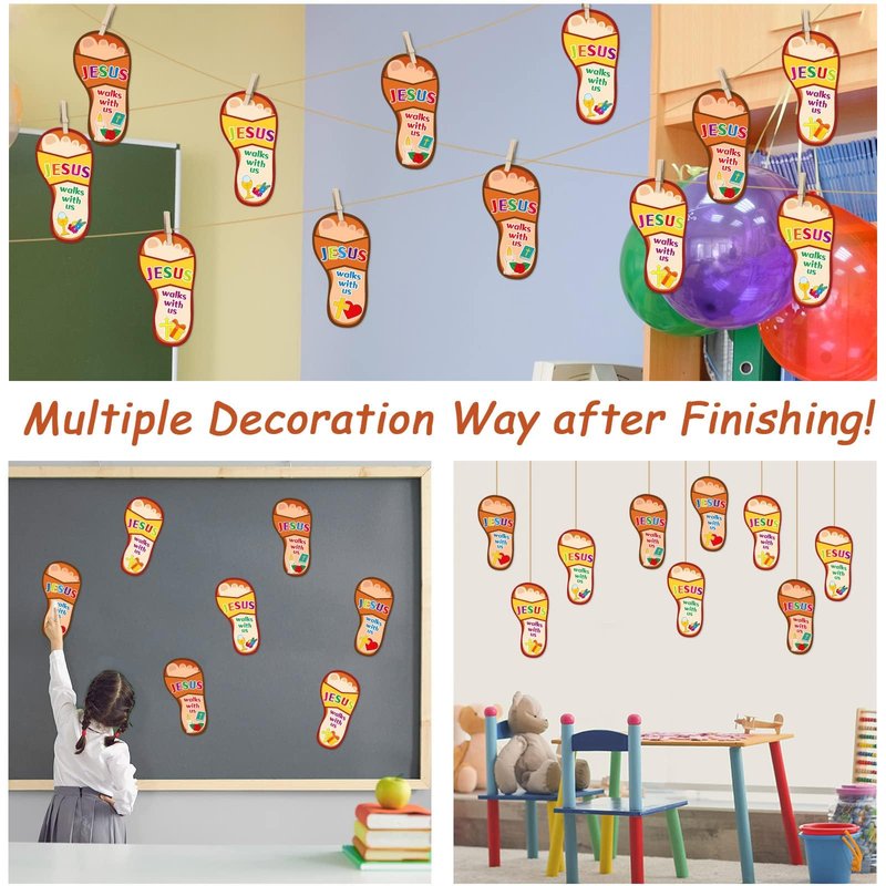 - 【Package Include】 For each religious Sunday school craft kits, you will receive 64 Jesus slipper cards ( in 4 styles ) and multiple sticker sheets(including over 380 pieces self-adhesive stickers that help finish the slipper cards) to let your kids create their own Jesus slippers. You will also get a 6m/19.7ft long string to hang the finished Jesus walks with us slippers.