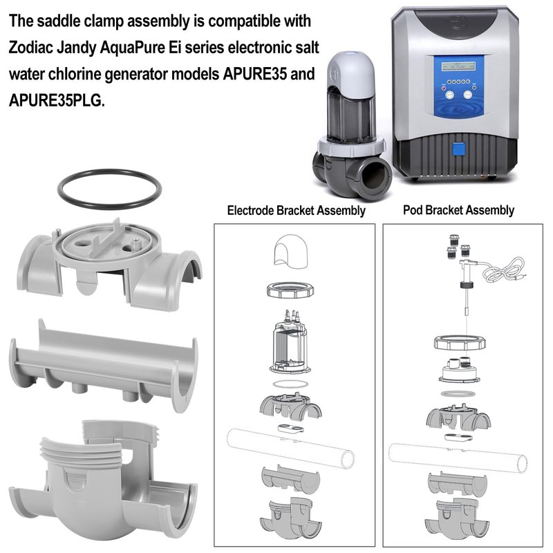 - APPLICATION: The R0511700 saddle clamp assembly is compatible with Zodiac Jandy AquaPure Ei series electronic salt water chlorine generator models APURE35 and APURE35PLG.