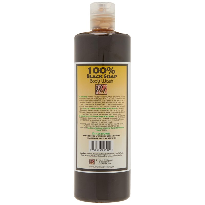 RA Cosmetics Liquid African Black Soap ensure that your skin remains acne free and breakouts. EVERYDAY REFRESHING BODY WASH Rids the skin of unwanted dirt & oils Treats eczema, acne, oily skin, scars, and stretch marks. Cleans pores and rejuvenates the skin, leaving your body fresh and clean Helps clear up pimples, rashes, eczema, acne and body odor Exfoliates and brings back the natural beauty of the skin Keeping that skin PH balance is maintained while soothing any irritation. Rich in Vitamin E, this body wash works like a charm on your skin and keeps it feeling hydrates, clean and fragrant throughout the day.