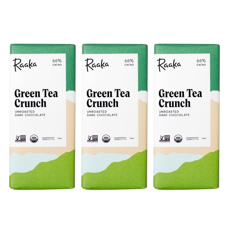 Raaka Chocolate Green Tea Crunch 66% Cacao Dark Chocolate | Gourmet Dark Chocolate Gift | Organic, Vegan, Fair Trade, Soy Free, Non GMO, Gluten Free, Kosher | 1.8oz Bars, 3-Pack