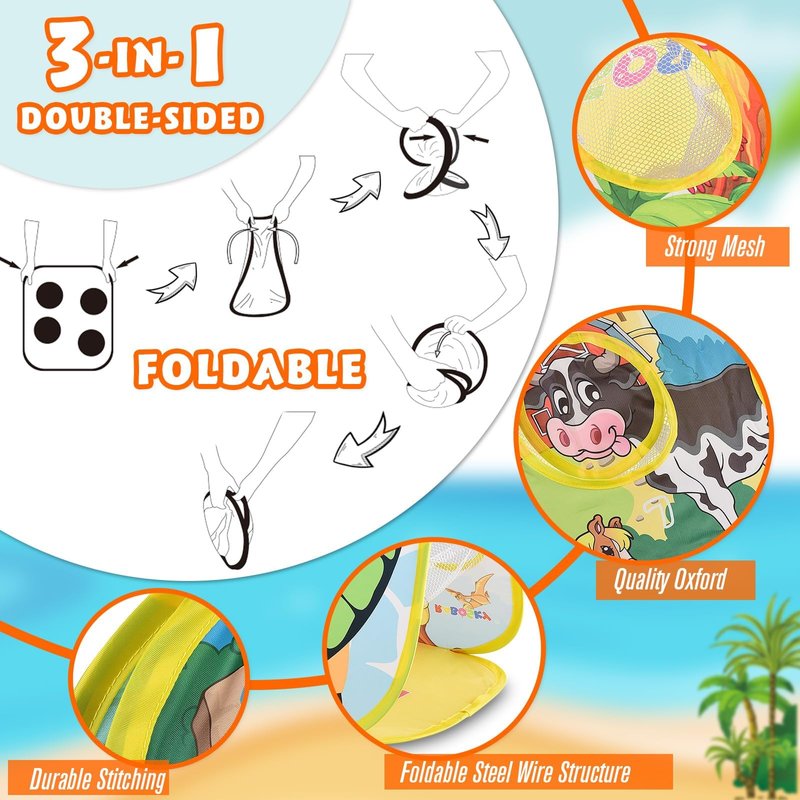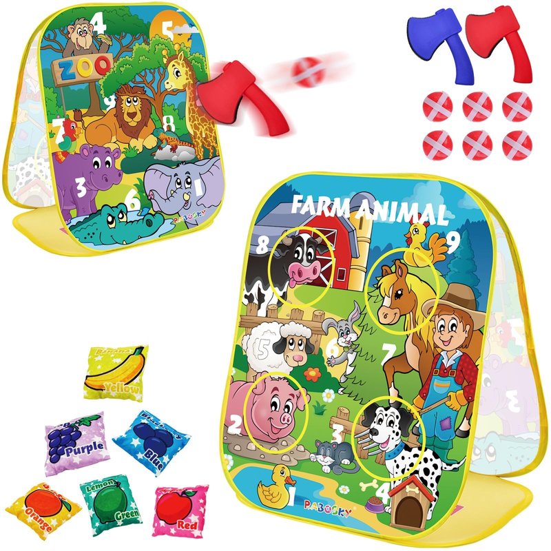 - 3-in-1 Tossing Play Fun for Toddlers: Flip between farm animals bean bag toss game, kids axe throwing game and animals sticky ball game, creating a versatile sports play experience with one Double-Sided cornhole game board