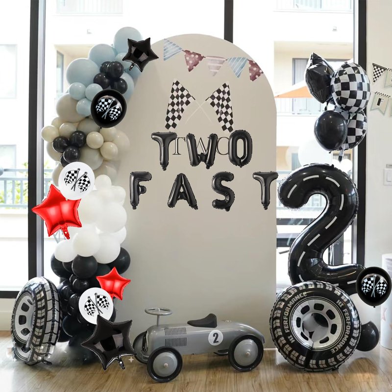 - [Package included] :1 pcs 40 Inch foil mylar racetrack black number balloon 2,2 pcs 18 Inch black and white chequered round balloons,1 set 16 inch(TWO FAST) letter banner balloon,4 pcs 12 inch checkered flag latex balloons,4 pcs star foil balloons (2 red,2 black ),1 pcs ribbon,1 pcs straw.