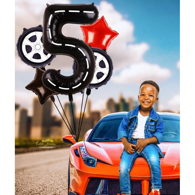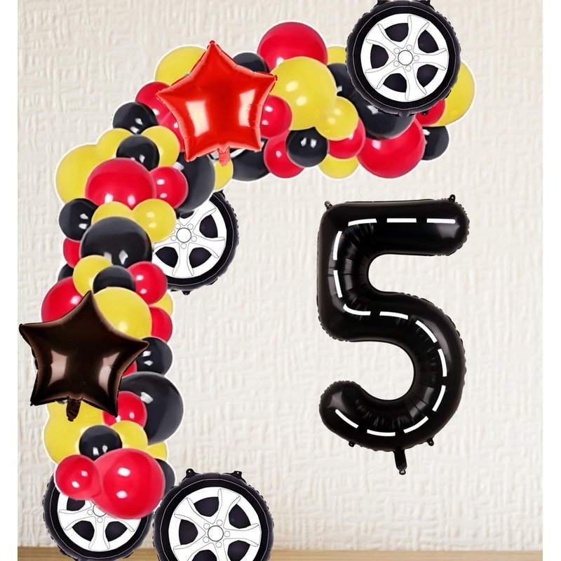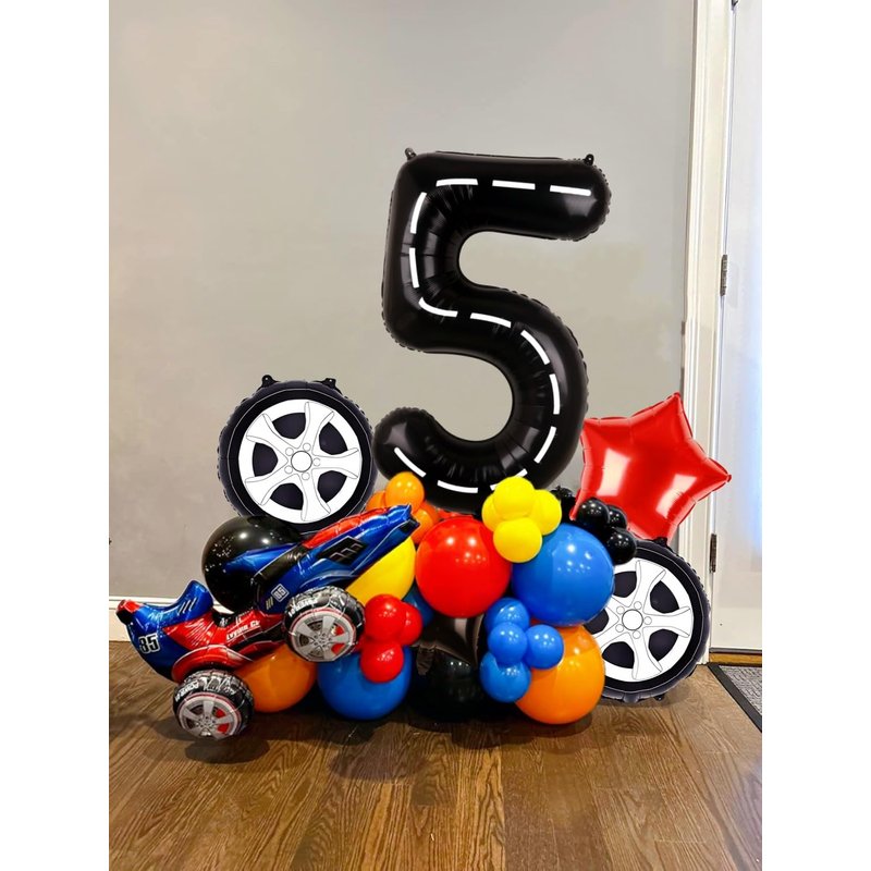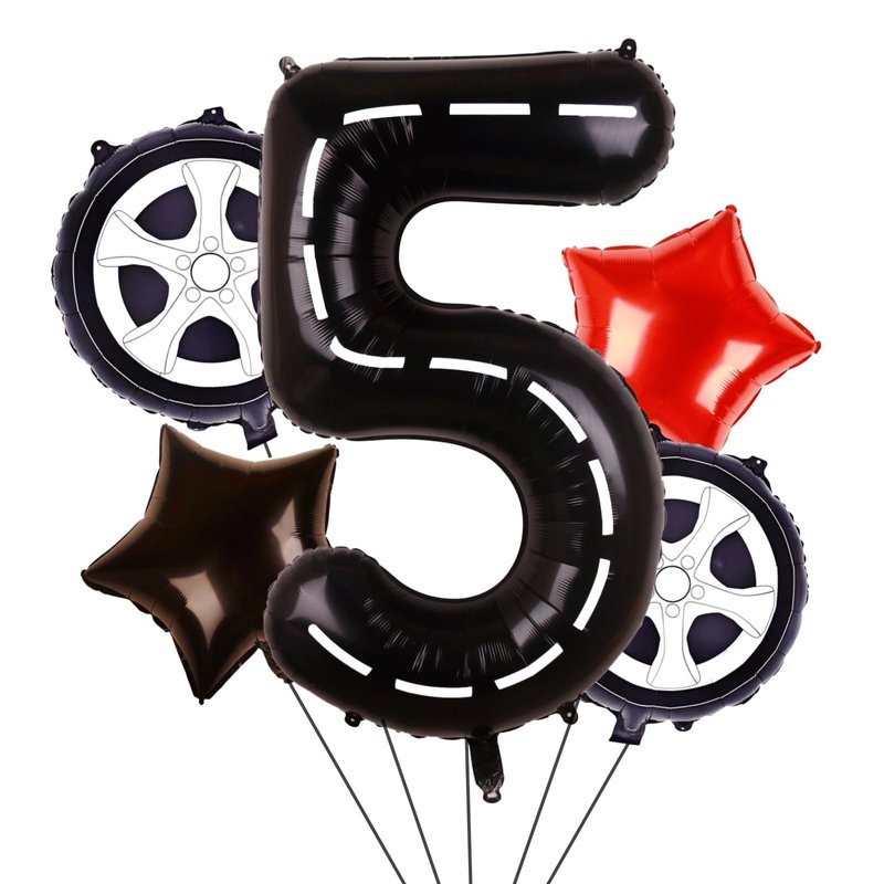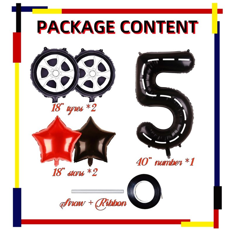 - RACE CAR BIRTHDAY PARTY SUPPLIES: 1 x 40inches black number 5 balloon (with white lines), 2 x 18inches wheels balloons, 2 x 18inches star balloons (1 black, 1 red), 1 x straw, 1 x ribbon.