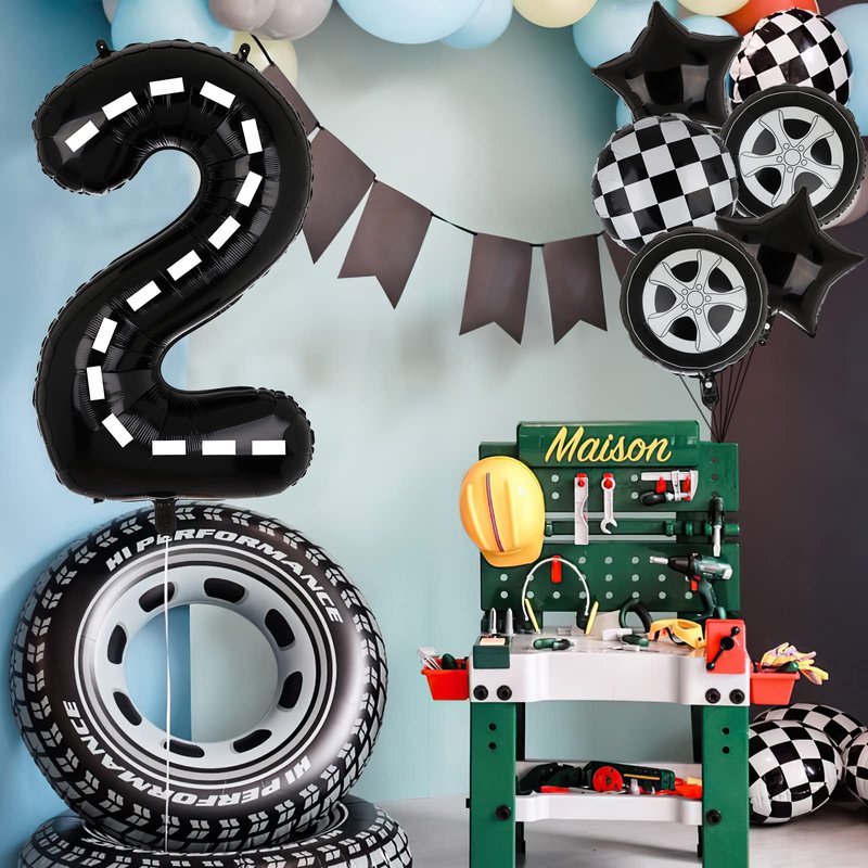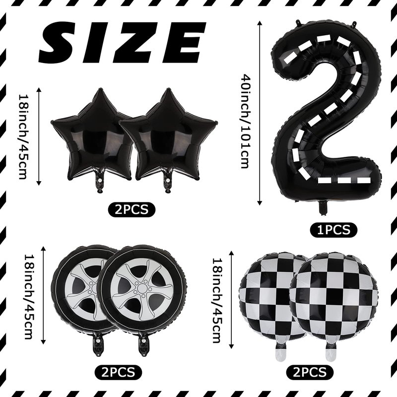 - 🏁Package: 1pc 40 inch race track number balloon black, 2pcs black and white chequered foil balloons, 2pcs black star foil balloons, 2pcs race track tire balloon.