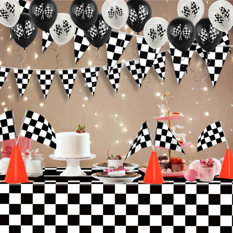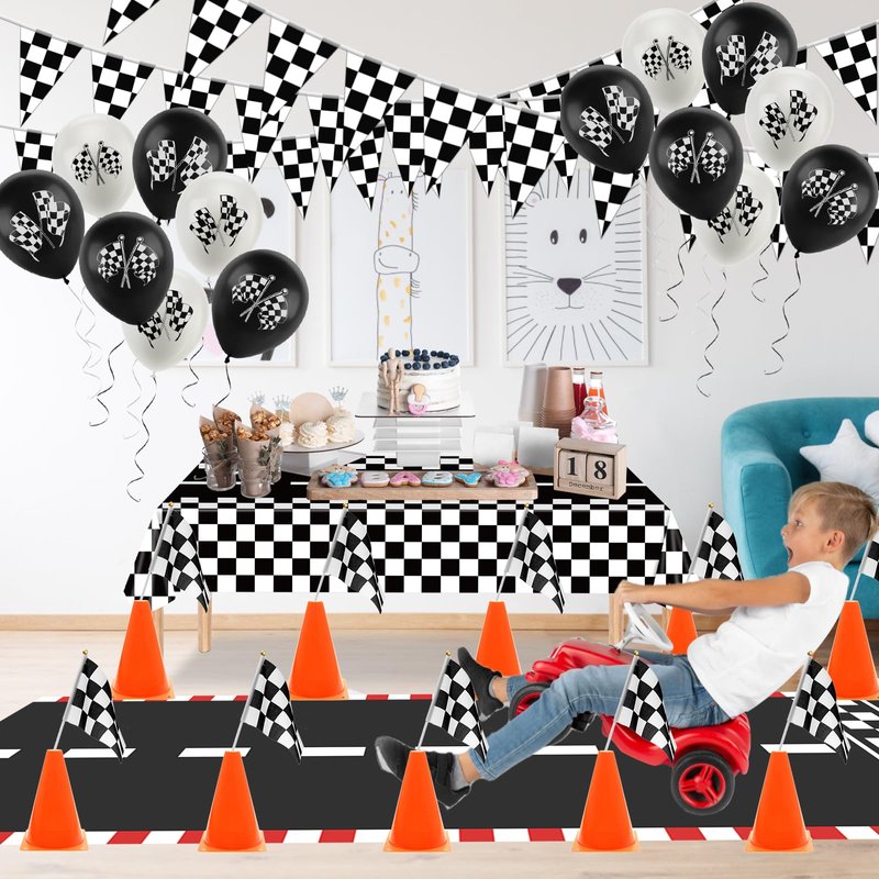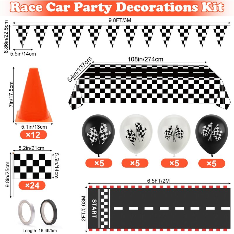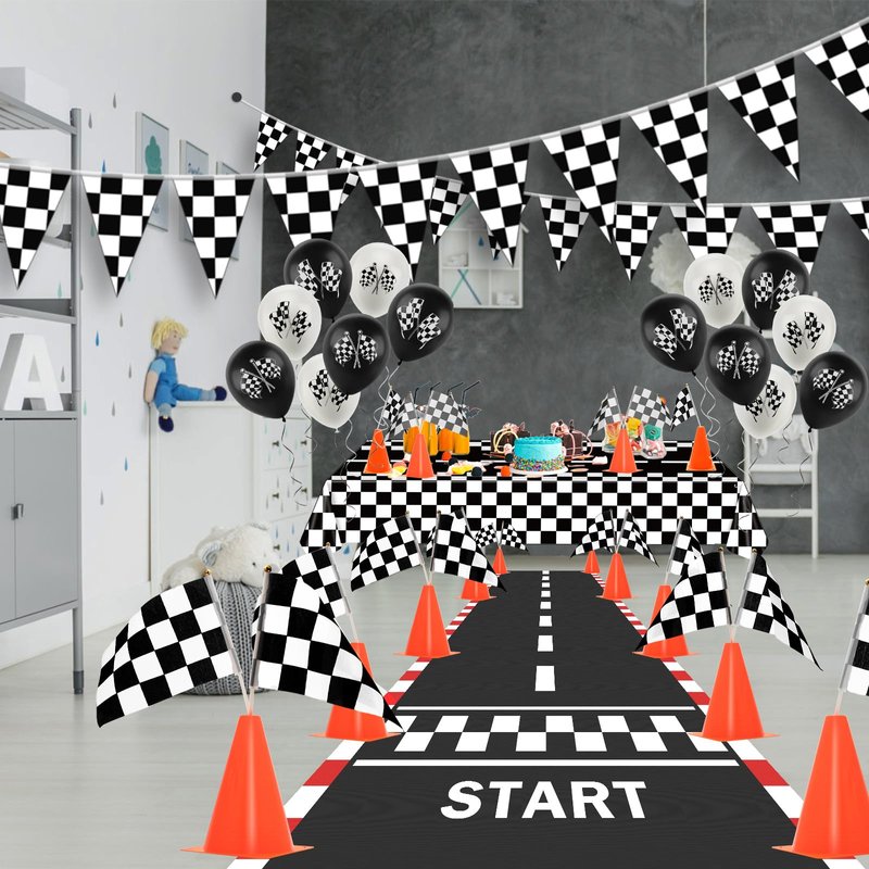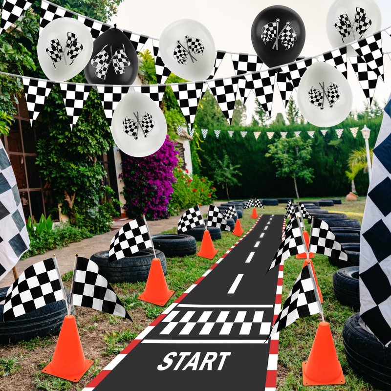 - 【61-Piece Racing Flags Decoration】Package includes 12pcs 7-inch traffic cones and 24 racing checkered flags with sticks, 1pcs 9.8ft long checkered pennant banner, 1pcs 6.5ft long racetrack running mat, 1pcs 108" x 54" checkered track tablecloth, 2 rolls of ribbon, and 20 balloons (4 styles) to meet your party decoration needs.
