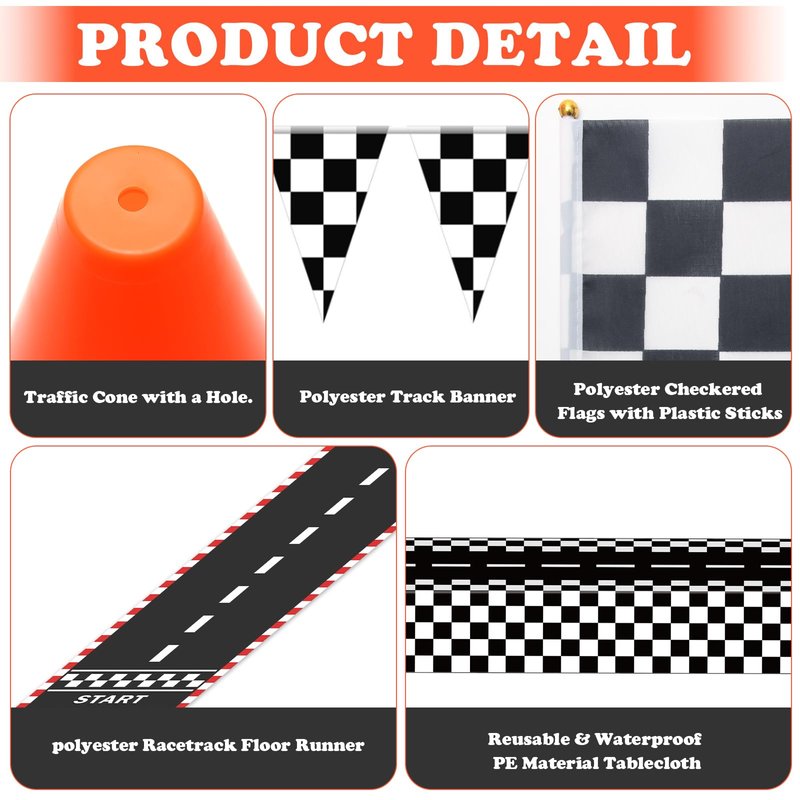 - 【Well-made】Traffic cones are made of premiun plastic, stable and not easy to break or deform. Polyester checkered flags come with plastic sticks, sturdy and not easy to break. Banner and racetrack runway are made of polyester fabric, and the tablecloth is made of PE material, waterproof, foldable and reusable.