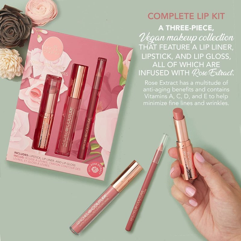 Rachel Couture Complete Lip Kit | Includes Lipstick, Lip Liner & Lip Gloss | Vegan & Cruelty Free | Infused with Rose Extract - Rose