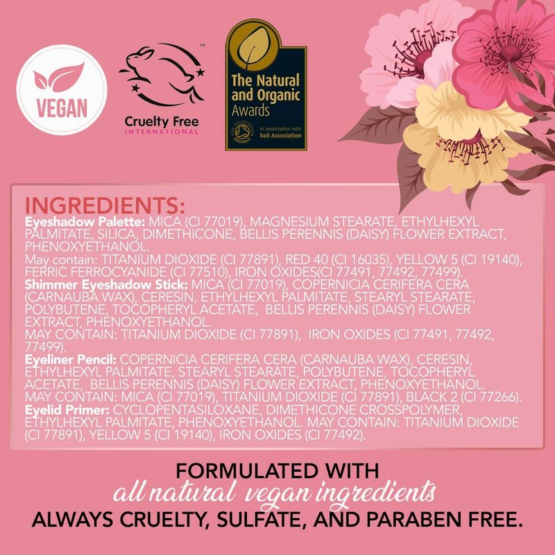 - EYE & LIP MAKEUP KIT - A vegan makeup collection that features a 4-Color Eyeshadow Palette, Shimmer Eyeshadow Stick, Eyeliner Pencil, and Eyelid Primer, all infused with daisy flower extract for added skin-nourishing benefits
