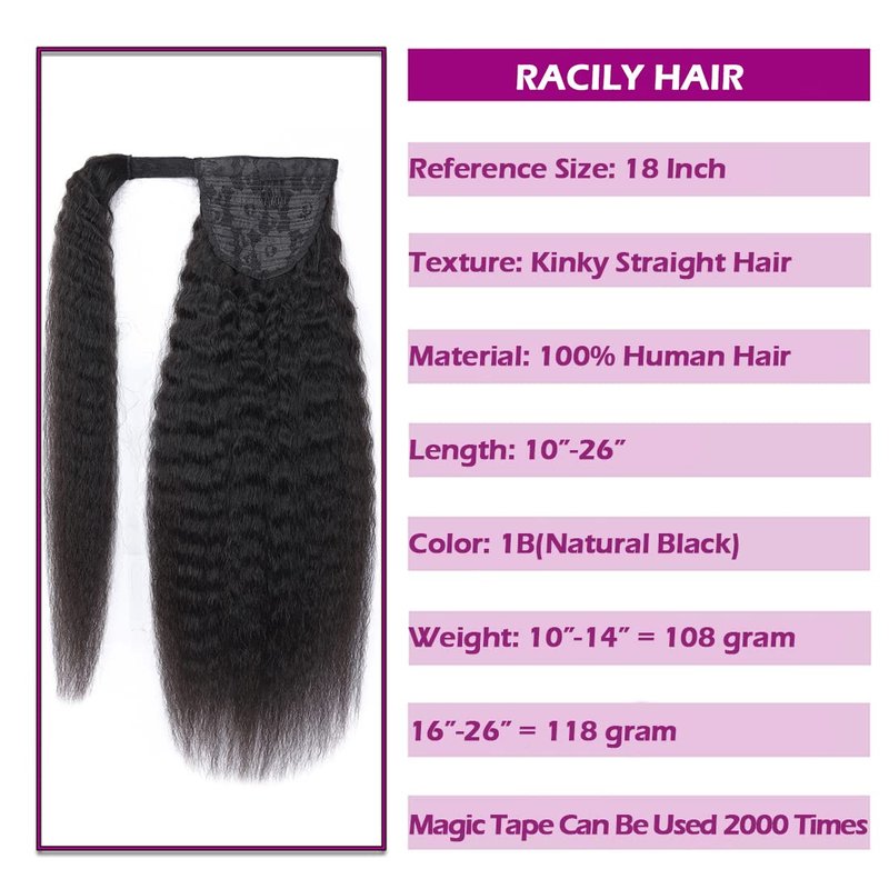 RACILY Kinky Straight Ponytail Human Hair with Wrap Around Magic Tape, Brazilian Hair Clip in Extensions Wavy Yaki Pony Tail Color Natrual Black (22", 1B, Kinky Straight, Wrap Around)