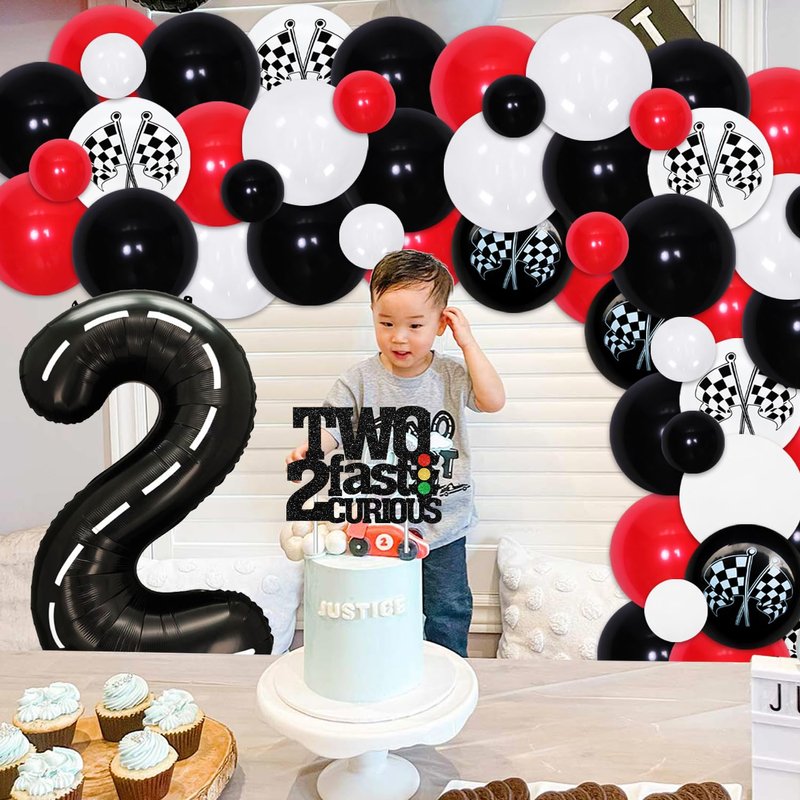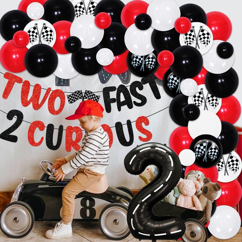 - 🏎️RACING CAR 2ND BIRTHDAY PARTY SET: This racing car includes 1*glitter TWO FAST 2 CURIOUS banner, 1* number 2 foil balloon, 1* TWO FAST 2 CURIOUS cake topper, 50*latex balloons(12 inches), 15*latex balloons(5 inches), and we will also give you some assembly tools to help you create a perfect racing car birthday party.