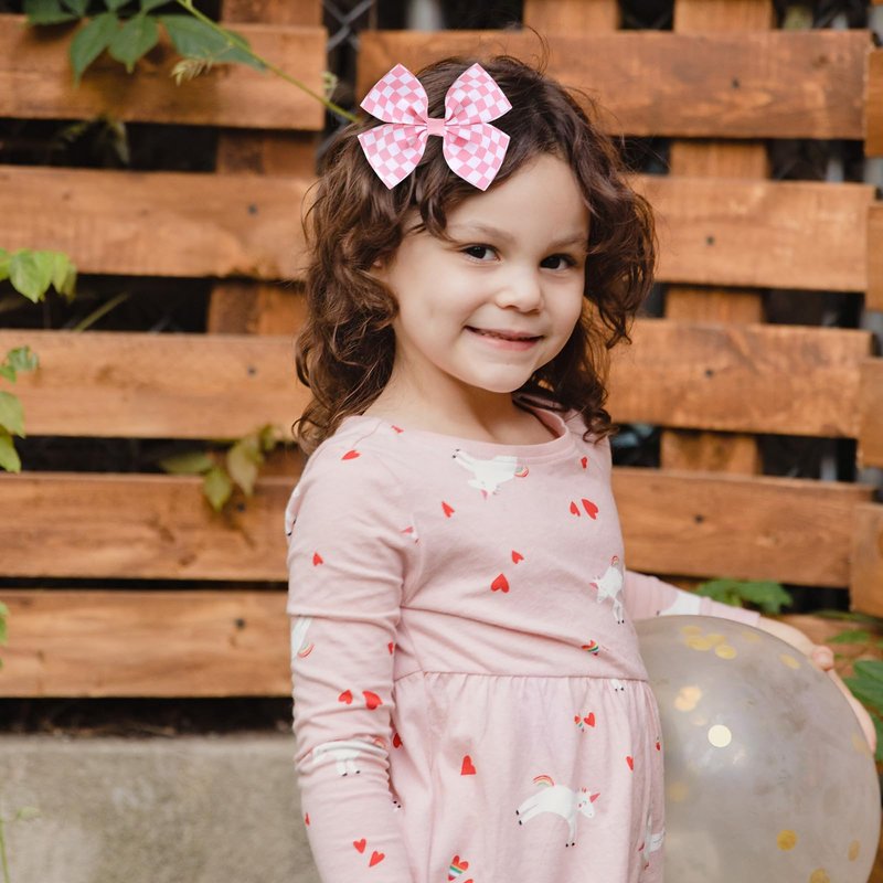 - Handmade Racing Checker Flag Hair Bows- Adorable pink and white plaid bow is well hand-made of vibrant checkered pattern grosgrain ribbon,soft and comfortable,easy to use;study alligator clip stays firmly on the head all day! Don't pull out any hair. Very cute ska hair bows, perfect for girls’ pigtails.