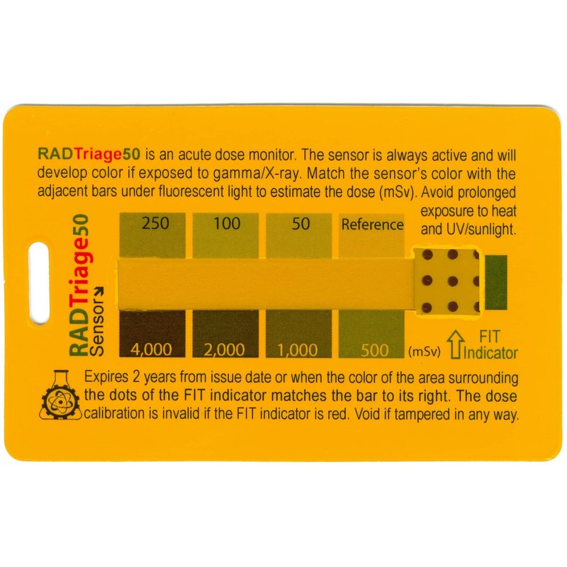 In the event of a radiological incident such as, a terrorist dirty bomb, rouge state action, nuclear power plant accident like Chernobyl or Fukushima – an accurate, easy-to-read dosimeter, like RADTriage50, is the first thing everyone needs. The sensor of the RADTriage50 dosimeter instantly develops color and the color intensifies with an increase in radiation dose. The dosimeter monitors only medically significant doses (50-10,000 mSv). The color development from exposure is cumulative and irreversible, this is especially important for individuals exposed to repeated diagnostic imaging or radiation exposure. The exposed radiation dose can be easily estimated by matching the color of the sensor with that of the adjacent color reference bars. The RADTriage50 dosimeter has a usable period of two years from issue date that may be extended up to 7 years if stored at 5°C and 10 years in a freezer at 0°C or below.