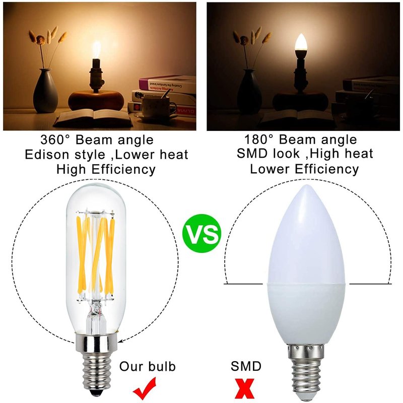 - Wide Applications:With 360°beam angle, this E12 tubular bulb has a wider irradiation range, ideally use for pendant lights,ceiling fans, chandeliers, wall lamps, ceiling fixtures, table lamps, etc.
