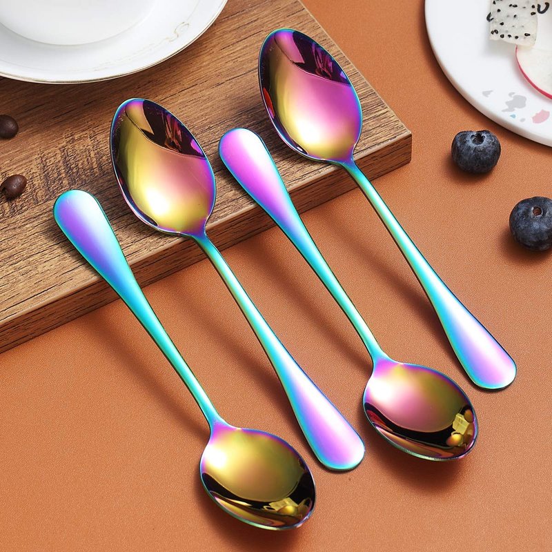- Set of 4 stainless steel 7.9" titanium rainbow plating dinner spoons, heavy duty and durable. Great for everyday use, hotel, restaurant, entertaining, holiday meal, parties, wedding, special event.