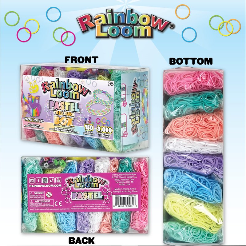 - HUGE 8000+ PIECE KIT: The Rainbow Loom Treasure Box Pastel Edition features 8,000 pastel rubber bands, 2 Happy Looms, and 150 colored C-clips. Enjoy hours of endless fun with 8 different colors of sparkle bands to work with!