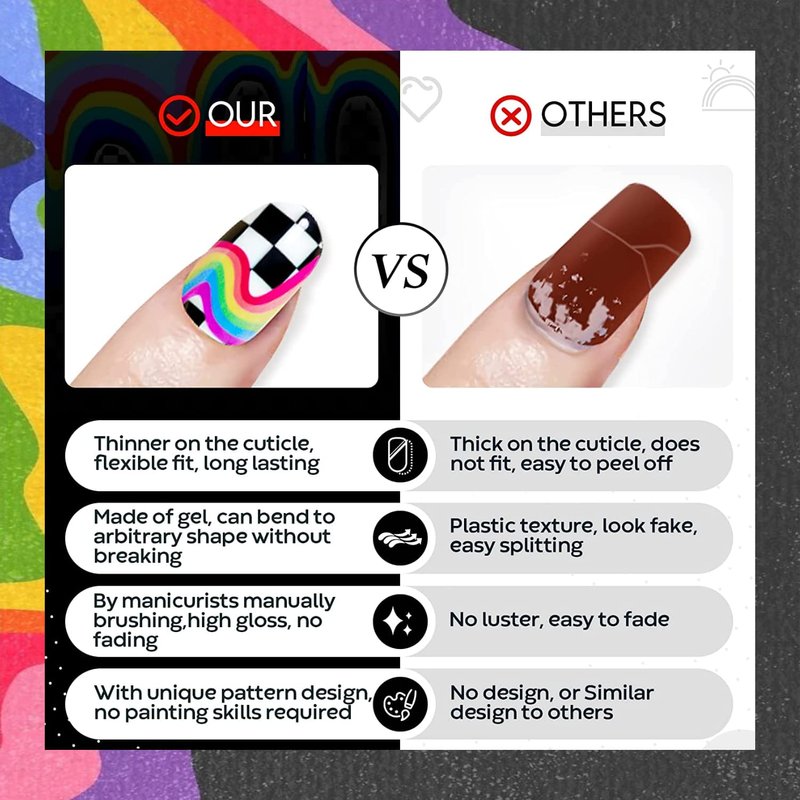- 🌈【An Amazing Gel Finish】1. Double structured design: more thicker on the fingertip for super durable and never splitting; thinner at the cuticle for a seamless look and natural looking fit. 2. Manual brush gel treatment on nail surface, achieving real gel shine, polish free, never fade.