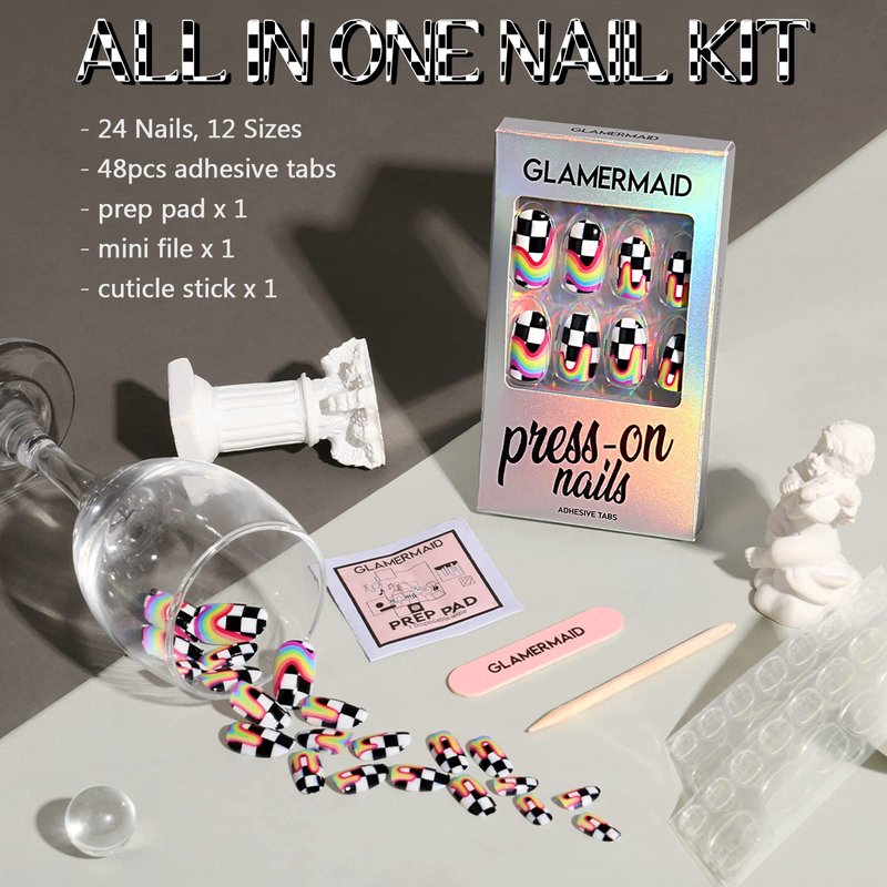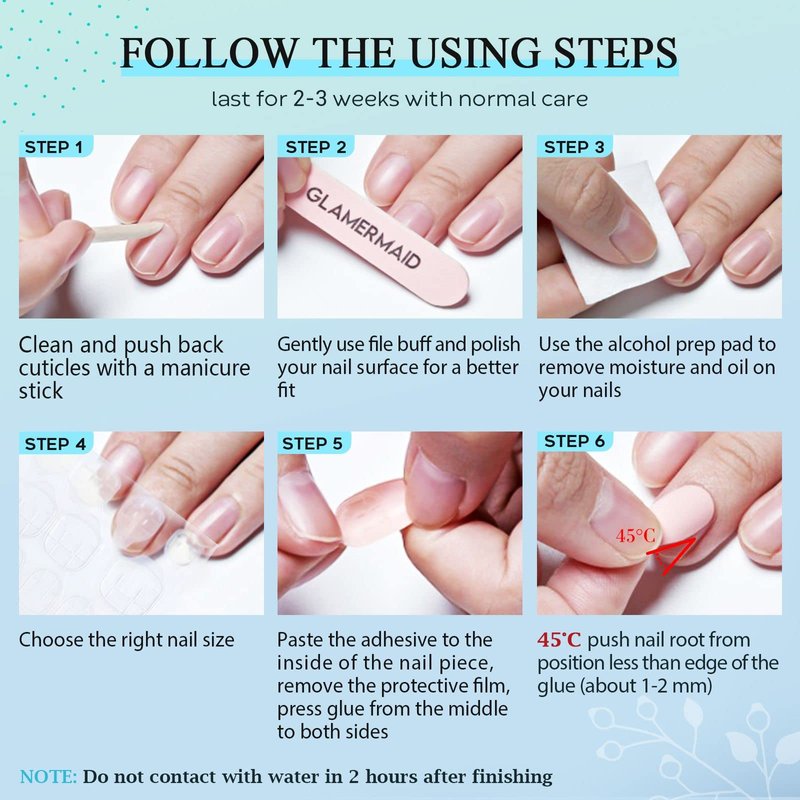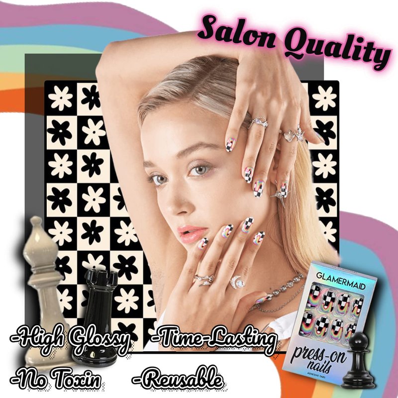 - ♟【Say Goodbye To Nail Polish】 GLAMERMAID New Generation Press-On Manicure. These fake nails come ready to wear, without nail polish, UV lamp and drying time, You can get a salon quality mani in minutes at home. Save yourself a 2-Hours trip to the salon and up to $60.