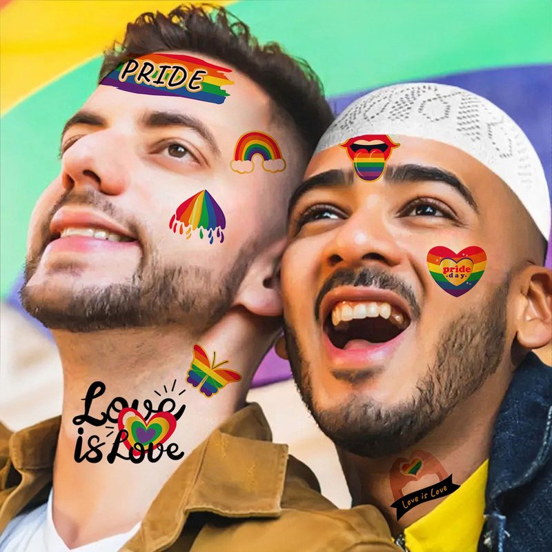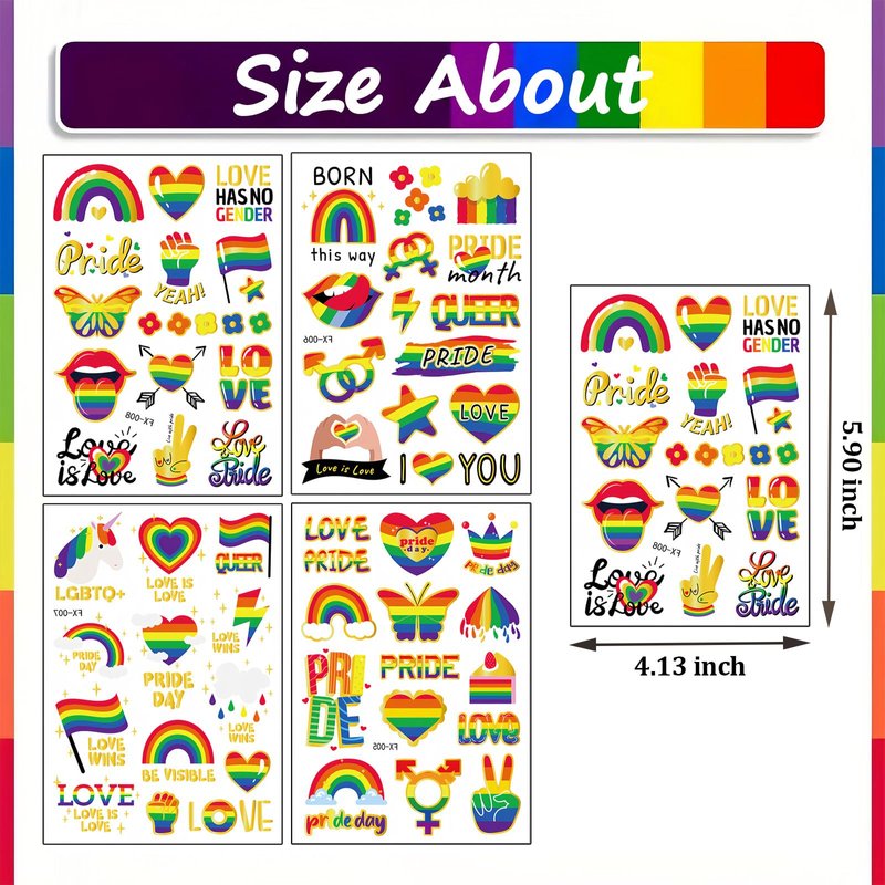 - 【Package】-- You will receive 4 sheets tattoo stickers with 60 types of Pride Day themes! The size of each sheet of paper is 4.13 * 5.90 inches. These cute and fashionable Pride Day themed temporary tattoos are suitable for Gay LGBTQ.