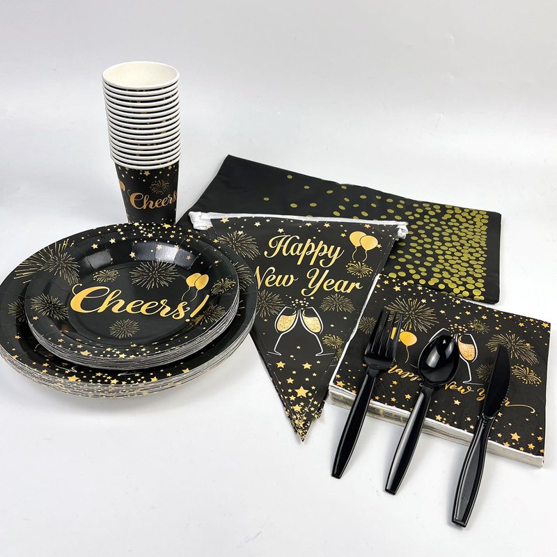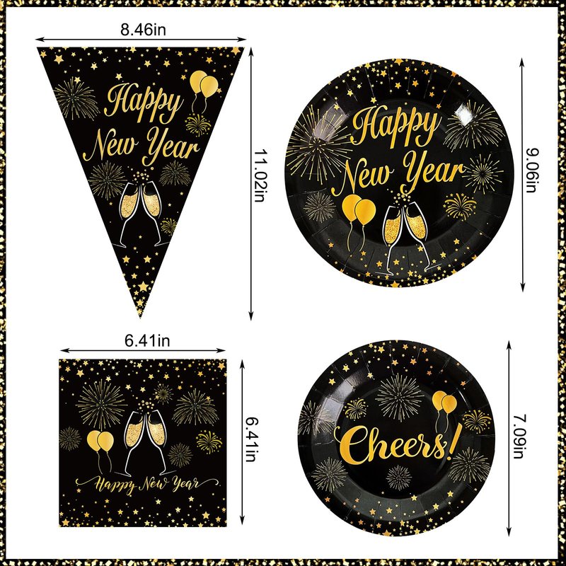 - 2025 New Years Party: Our 2025 new years eve party supplies are carefully designed, New Year's Eve party paper plates printed with wine glass patterns, balloons and firework patterns, new years party table cover printed with gold stamping star, gold dot patterns, perfect for new year eve gathering decoration supplies, add more festive atmosphere! These black and gold dinnerware set can meet 20 persons needs, make your new year eve party dinner experience impressive!