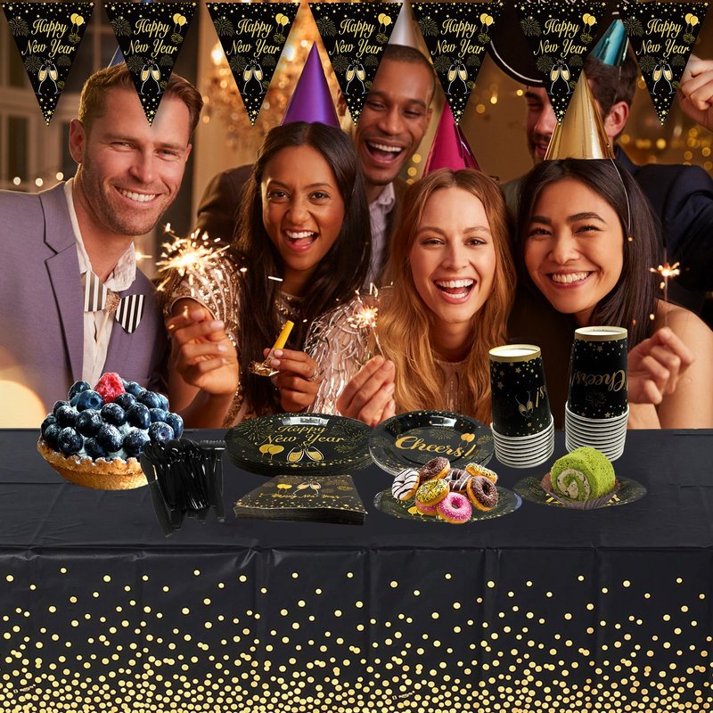 - Save Your Time: This New Years themed party set is perfect for a 2025 New Years Eve celebration! Spend more time with your guests as this party pack contains all of your new year party tableware needs. No wash up! You just need to throw paper cups, table cover, utensils, cutlery bag, napkins into the trash can after the party.