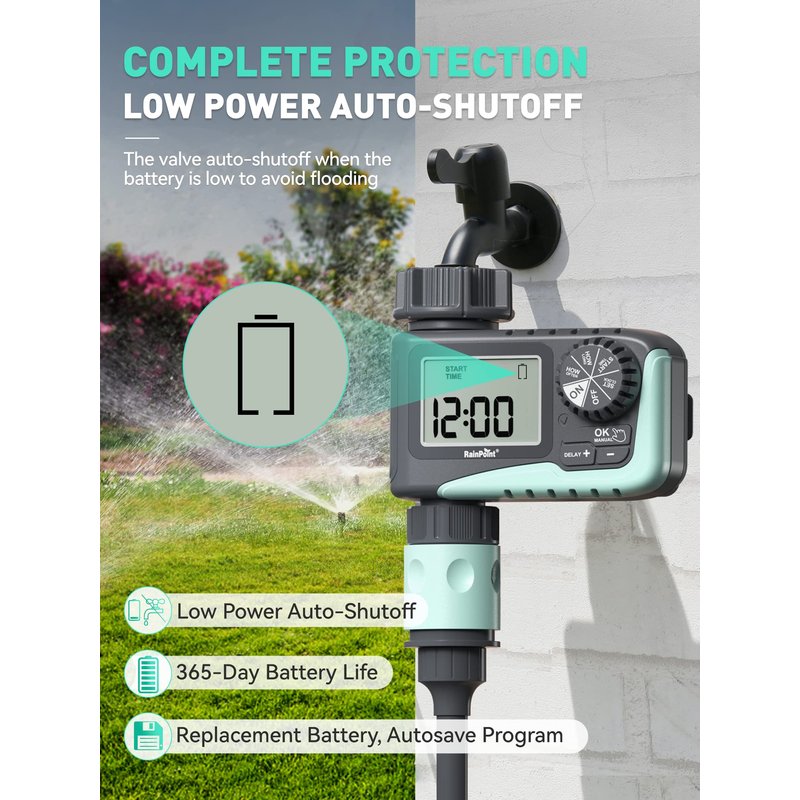 - 【Rain Delay & Manual Mode】With rain delay mode, your programmed schedule will be paused for 24, 48, or 72 hours, and will be automatically resumed. Using manual mode, any lawn or garden can be watered as needed, with customizable times from 1 min to 8 hrs, and without interrupting your schedule.