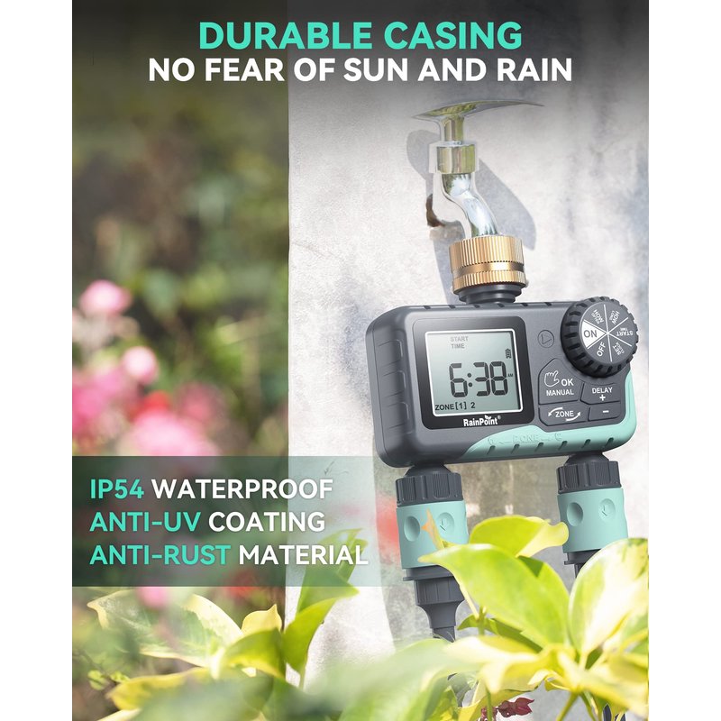- 2 SEPARATE PROGRAMMABLE ZONES - RAINPOINT sprinkler timer with 2 large outlets (Flow Rate 5-35 L/min), allows you to customize the watering schedule (start time, frequency, and run time) per zone, giving you complete control over the watering of each area of your yard and lawn, water your lawn evenly, efficiently, and effortlessly!