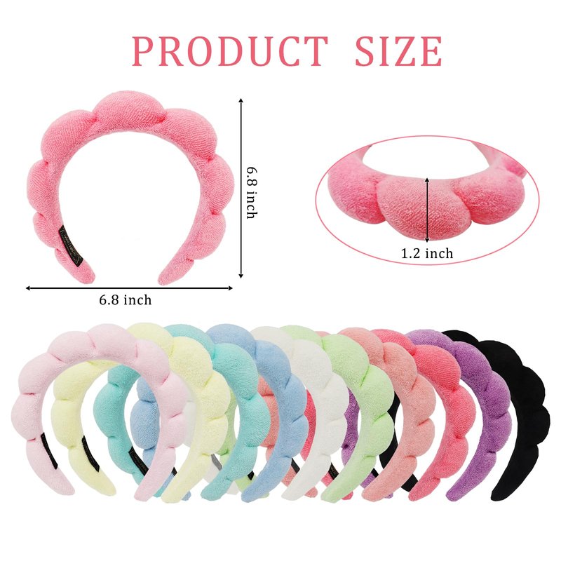 Features: the sample could be widely us Specifications: Sponge thickness is 1.2inch/3cm, width 1.38 inches/3.5cm Material: Sponge and Terry cloth fabric Color: multicolor/ as picture shows Size:7.08 X 7.08 X 1.38 inches Package includes: 10 x Headbands for women and girls Notes: Manual measurement, please allow slight errors on size The color may exist a slight difference due to different screen displays.