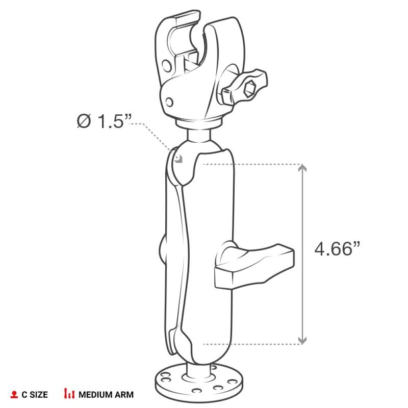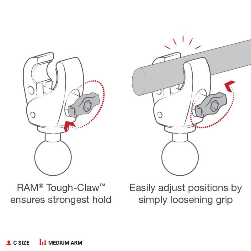 - Includes small version of the RAM Tough-Claw, medium length C size RAM double socket arm, and 2.5" round plate with C size 1.5" RAM rubber ball