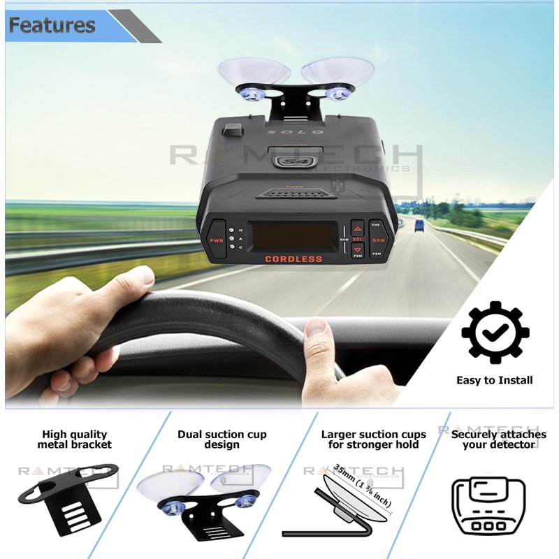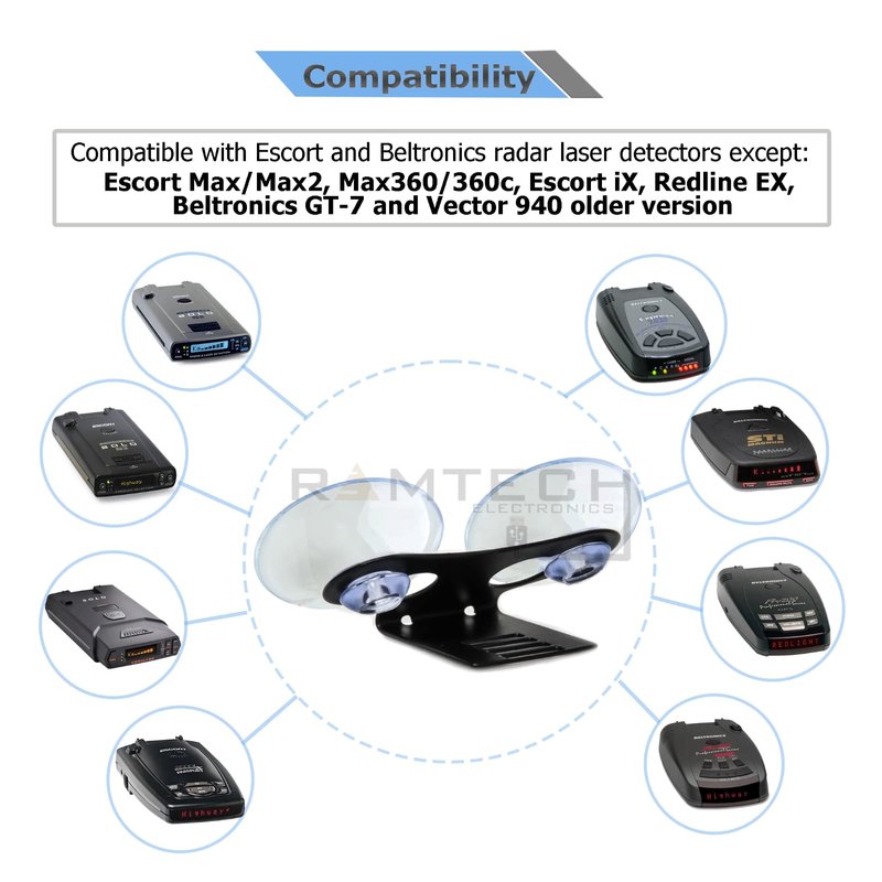 Ramtech Car Windshield Mount with Suction Cup Holder for Radar Laser Detector, Compatible with Escort Solo S2 S3 S4 4 5 RD-5110 / Redline, WMLD