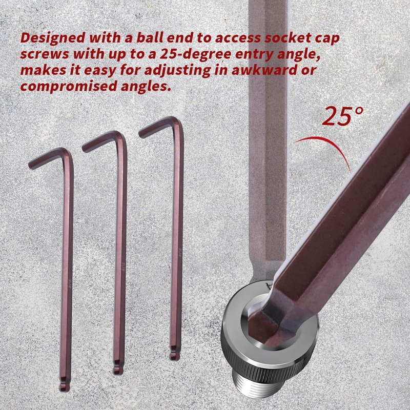 - 【Ball End Design】Designed with a ball end to access socket cap screws with up to a 25-degree entry angle, makes it easy for adjusting in awkward or compromised angles.