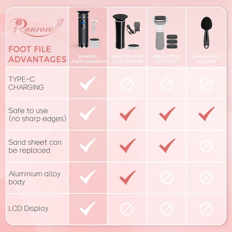 - 【Perfect Present】Ranrose electric foot file can eliminate cracking, dryness, dead skin, and calluses on the heel of the foot. The handle of electric pedicure tools for feet is easy to hold and convenient to use, and it is an ideal present for giving to your lover, family, and friends. If you have any questions about our foot file callus remover,please contact our professional customer service team.We will solve your problems in time!