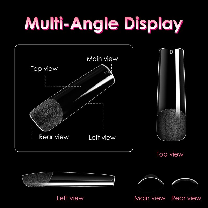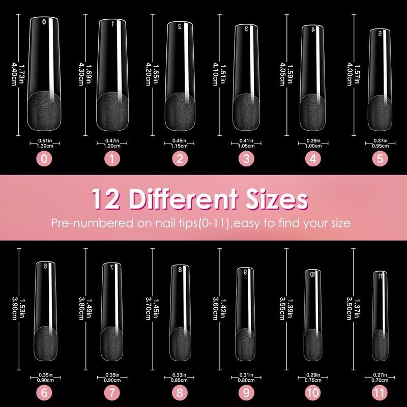 - Simple Operation:We just need to pick the clear nail tips to suit the length and size of each nail. After matching a suitable false nails,apply glue to the edge of the fake nail,press it on your nail for 10 seconds,and then shine a nail lamp on it for 1 minute. Also this straight nail tip is XXL plus length, we can trim it to the shape and length we want.