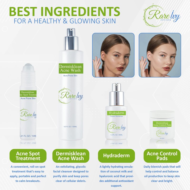 Rare Ivy Dermisklean Acne Kit- 4 Step Facial Cleanser, Acne Control Pads, Acne Spot Treatment, Hydraderm Coconut Moisturizer- Perfect for Reducing Pimples, Blemishes- Balance Oil and Rehydrate Skin