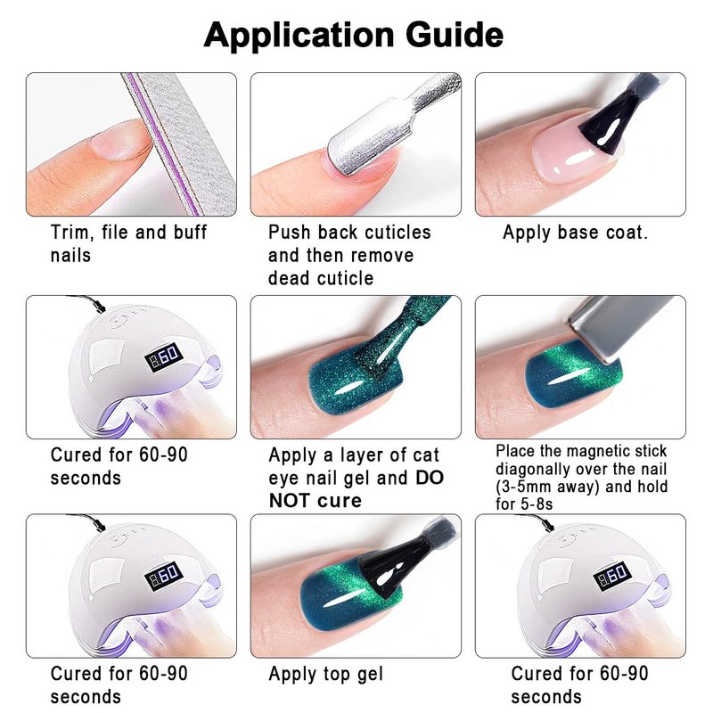 - 【HOME SALON QUALITY】Glitter cat eye gel nail polish is good choice for use in a professional nail salon or nail starter at home.You can design your own manicure at home to show your style. Remember the gel polish needs to be cured under LED or UV nail lamp. Average for Nail Lamp 60-120 secs.