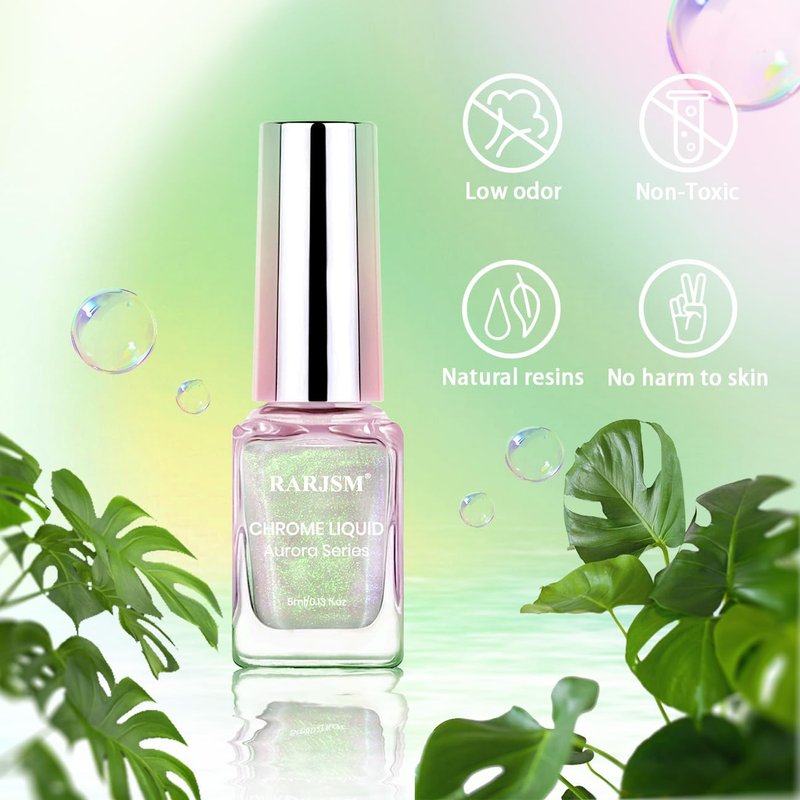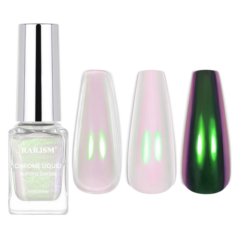 - WIDE APPLICATION:RARJSM chrome powder liquid can be applied on UV gel nails,acrylic nails,natural nails or false nail tips.Apply on different color gel will get different effects,apply on black gel nail you can get a metallic effect;Apply on clear nude nail you can get the pearl aurora effect.