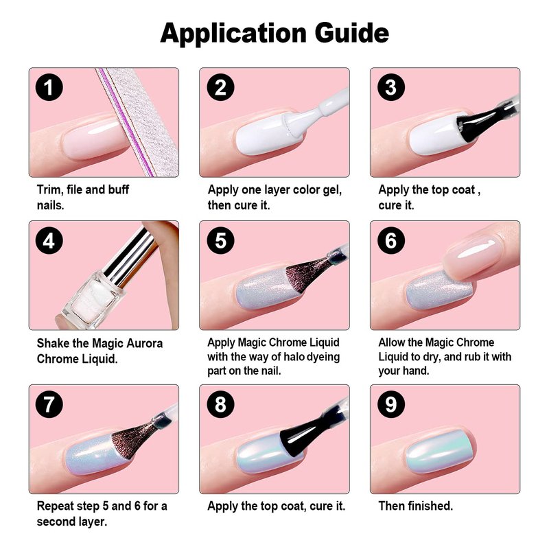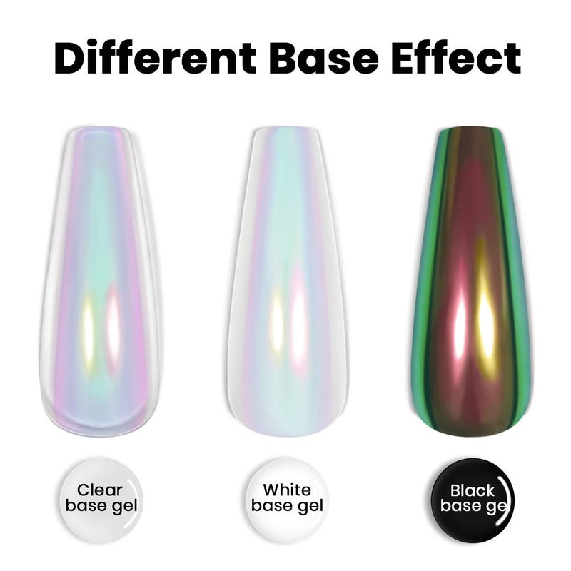 - NO UV LED LAMP REQUIRED:This magical aurora chrome powder liquid don't need to cured under uv or led lamp,it can be quiky dry by air,very convenient for the nail art design use.Easy to apply,just rub it on the nail can get the magical chrome effect.