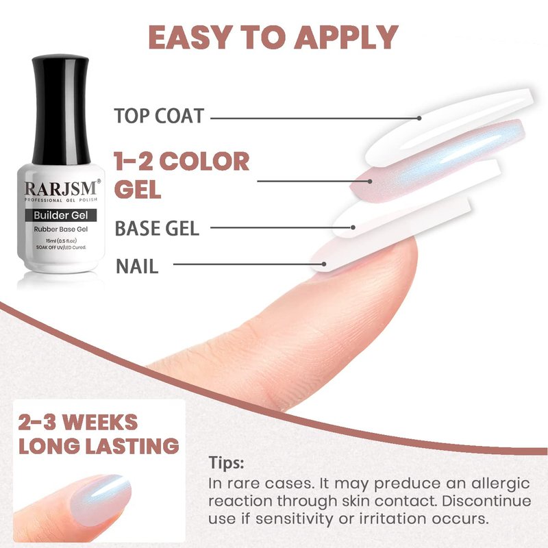 - MULTIFUNCTIONAL GEL BUILDER:RARJSM gel builder nail polish is a pearl glitter gel and it tends to be thicker than regular gel nail polish.Gel builder can be used as structure gel ,quick extension gel, color gel and nail strengthener gel. Also, it helps to make your nails more flexible if you have weak and brittle nails that might break or crack easily
