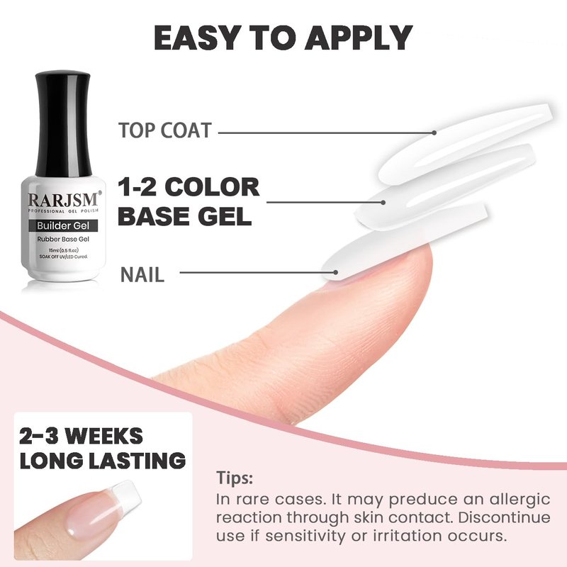 - 【MULTIFUNCTIONAL RUBBER BUILDER GEL】RARJSM sheer rubber base gel nail polish is a nude skin tone gel and it is tend to be thicker than a regular base coat.Rubber base gel can be used as base coat,quick extension gel,clear color gel and nail strengther gel. Rubber base gel also helps to make your nails more flexible if you have weak and brittle nails that might break or crack easily.