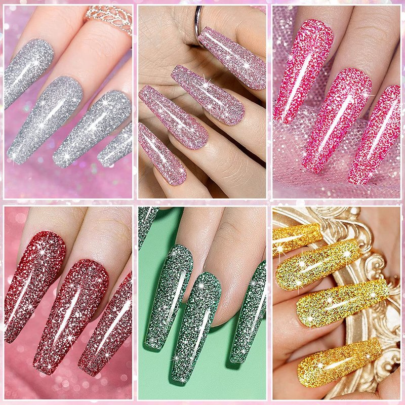 RARJSM Glitter Gel Nail Polish Set, Reflective Shinny Gel Polish Explosion Diamond Nail Gel 6PCS Gold Hot Pink Green Red Silver Gel Nail Art Varnish Manicure Kit in Gift Package