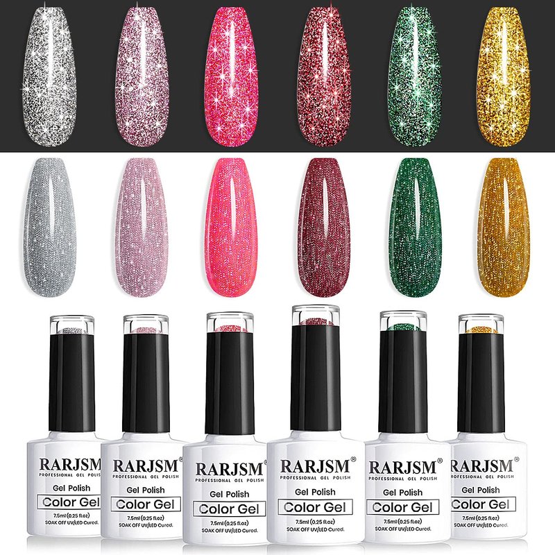 - GLITTER GEL NAIL POLISH SET: RARJSM gorgeous and super sparkly glitter gel nail polish contains 6* 0.25oz glitter colors gel including sliver gold pink green neon pink red and a gift box.