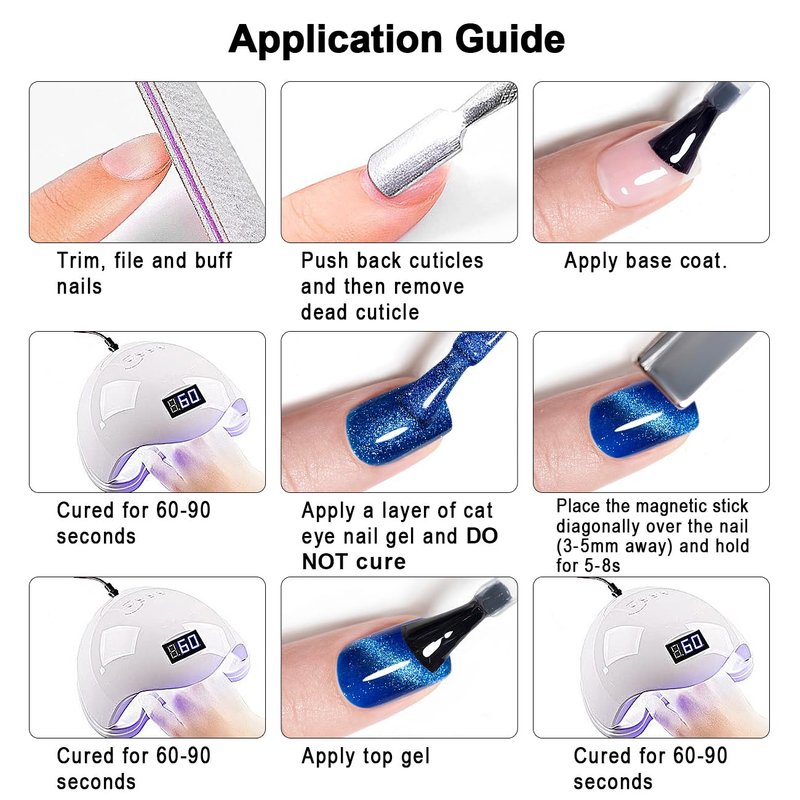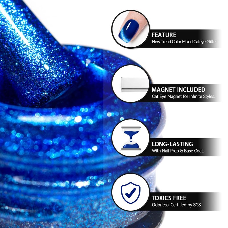 - 【HOME SALON QUALITY】Glitter cat eye gel nail polish is good choice for use in a professional nail salon or nail starter at home.You can design your own manicure at home to show your style. Remember the gel polish needs to be cured under LED or UV nail lamp. Average for Nail Lamp 60-120 secs.