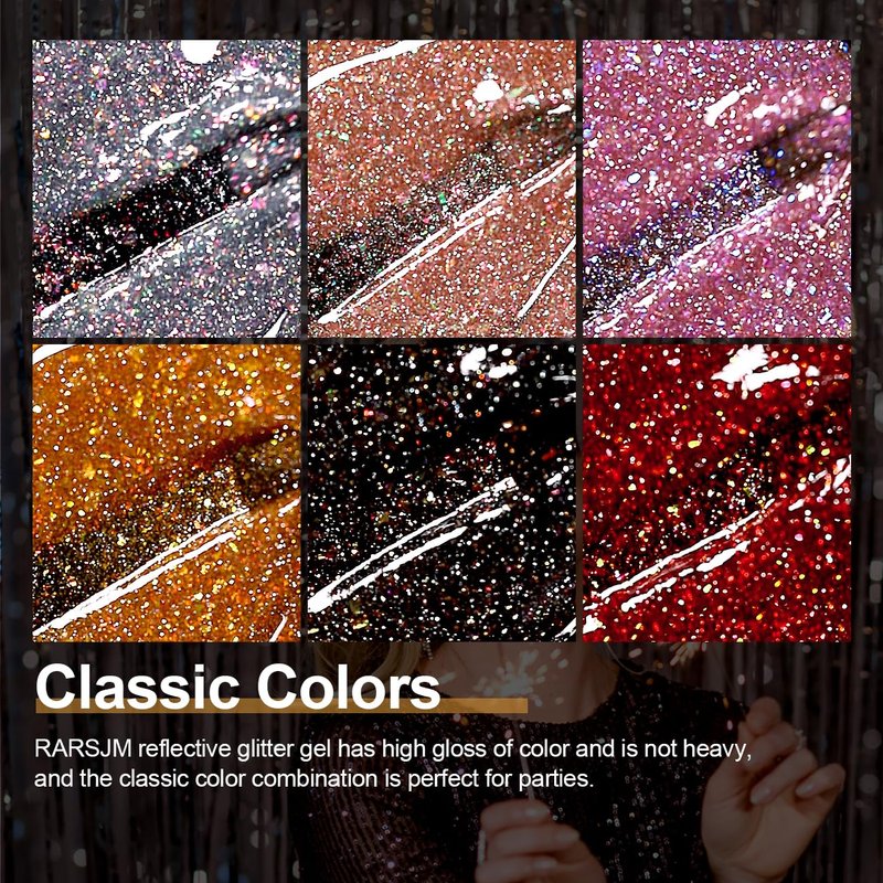 - 6PCS GLITTER GEL NAIL POLISH SET:RARJSM reflective glitter gel nail polish set includes 6pcs 7.5ml/0.25 FL OZ sparkle glitter gel polish.Classic colors of sliver champagne gold pink orange black and red combination set.RARJSM reflective glitter gel nail polish has further upgraded its design,adding rainbow flash diamonds and sequins to the traditional reflective glitter gel polish foundation.Whether it's you or your manicure,it will be the most shining