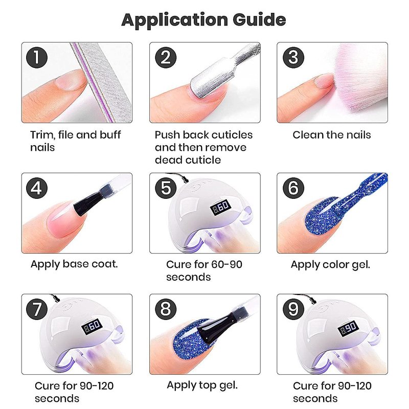 - SALON-QUALITY NAIL GEL:The formular of this quick dry sparkling diamond gel polish it is low odor and no harm to your nails.You can enjoy the nail design at home and finish off with nail salon effect.