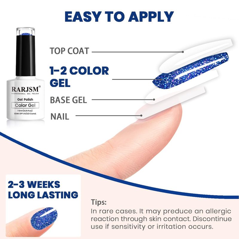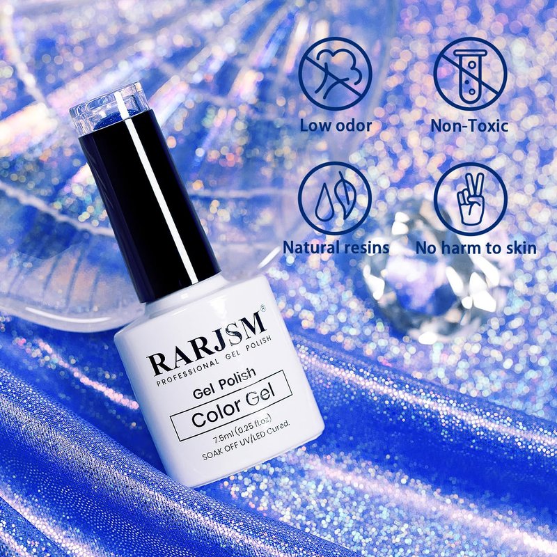 - NAIL LAMP REQUIRED:RARJSM flash reflective glitter gel polish need to cured under nail lamp.With proper application this low odor shimmer glitter gel polish can keep perfect more than 2 weeks.It’s a highly-pigmented, long-lasting polish that won’t chip or smudge.No harsh ingredients or adhesives with low smell, rich color, middle consistency, self-evenly, no shrink and edge.
