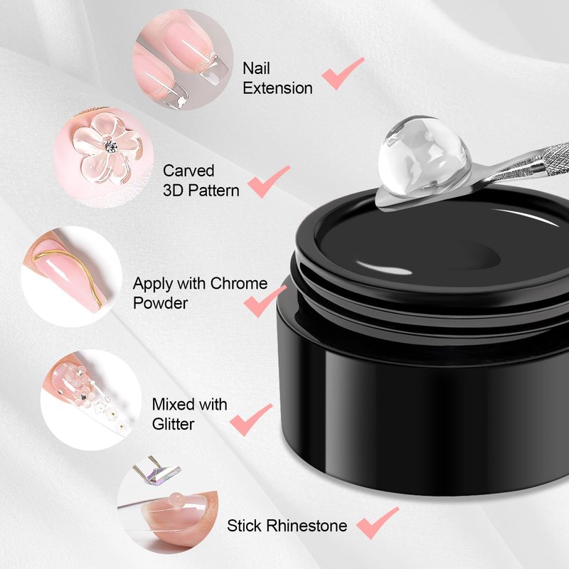- 【MULTIFUNCTIONAL SOLID BUILDING GEL】This solid builder gel feels like plasticine,you can knead into various shapes,its application is very wide,you can use it to do nail extension like acrylic nails,you can do nail sculpture of various shapes,you can apply chrome powder and mixed glitter,you can do all kinds of 3D nail art decoration DIY.More nail art is waiting for you.