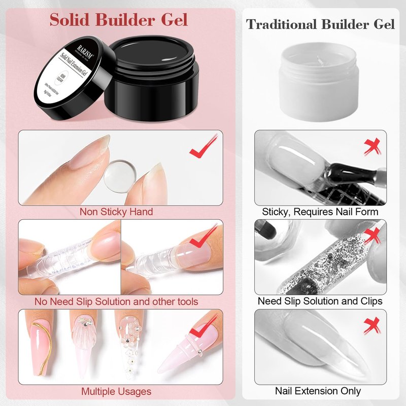 - 【HEALTH】The RARJSM solid building gel is made of healthy ingredients,no irritating odor,environmentally friendly and non-toxic,harmless to the skin and natural nails,providing you with a comfortable and happy nail experience.Please do a skin test before use to prevent discomfort.Keep solid nail gel away from sunlight or other bright light.(uv/led lamp)