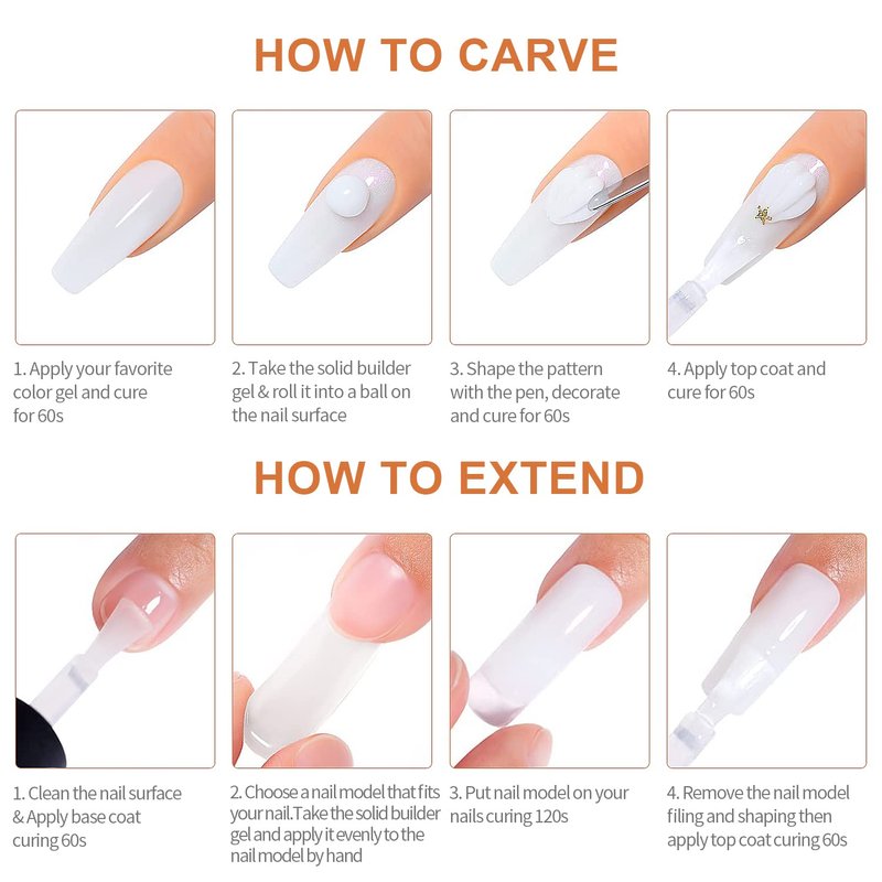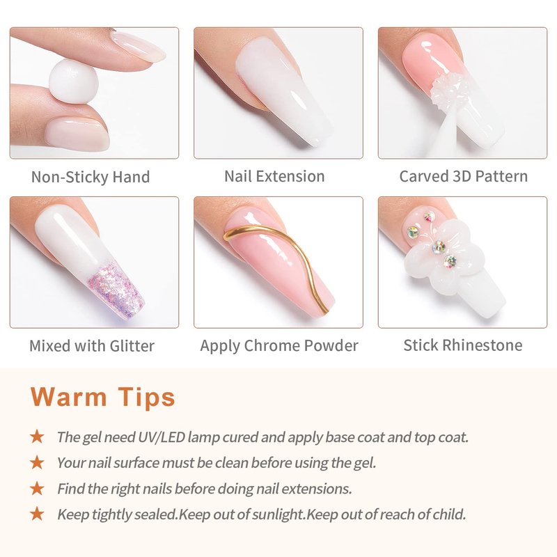 - 【Multifunctional Solid Building Gel】This builder nail gel feels like plasticine,you can knead into various shapes,its application is very wide,you can use it to do nail extension like acrylic nails or poly gel nails,you can do nail sculpture of various shapes,you can do all kinds of 3D nail art decoration DIY.In addition to these,it can be used as nail tips glue gel rhinestone glue gel.More nail art is waiting for you.