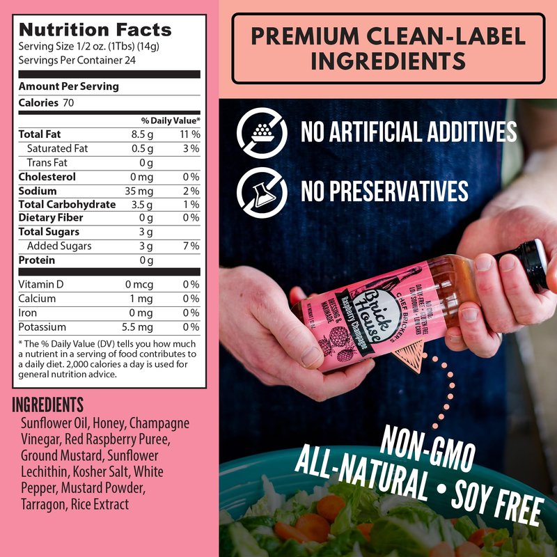 Pop the cork and grab a fork! We know most salad dressings are full of junk - our promise is to stay clean. Other brands offer watered-down products with unhealthy hidden additives like xanthan gum, MSG, starches, or food colorings. Not us. We’d only offer to put something on your table that we’d put on ours - the BEST tasting healthy food. We use premium, fresh, natural ingredients without adding any artificial preservatives, sweeteners, or stabilizers. You've finally found the delicious and low sodium salad dressing you've been looking for! Raspberry Champagne - No, its not alcoholic... but you may definitely want to bring it to your next party! Our Raspberry Champagne is sure to bring the pizazz to your salads and other dishes. We take a champagne vinegar and soak a gourmet raspberry puree in it, then add in the cold pressed, non-gmo sunflower oil and naturally sweeten it with honey - no artificial sweeteners or preservatives! We only use fresh and whole ingredients you can pronounce, such as kosher salt, white pepper, sunflower lecithin, tarragon, & mustard powder. The result? A delicious, tart and light salad dressing! Whether its a hot day at the grill or slow baked dinner at home, our raspberry vinaigrette dressing is the perfect fit for those looking enhance their summer salad, broccoli salad, or even marinated chicken breast, fish or prok!! Its a Non-Gmo, egg-free, gluten-free, dairy-free, soy-free, keto friendly, low sodium, and low carb salad dressing. You don't have to choose between food that tastes good and food that is healthy. Brick House is the "Vinaigrette with No Regret."