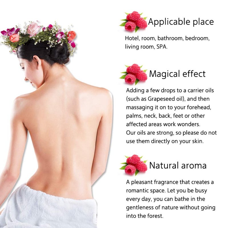 - Usages - Used for essential oils diffuser to create an atmosphere. Our Raspberry oil can also be used for skin care, hair care, massage, bathing, making perfumes, soaps, scented candles and more.