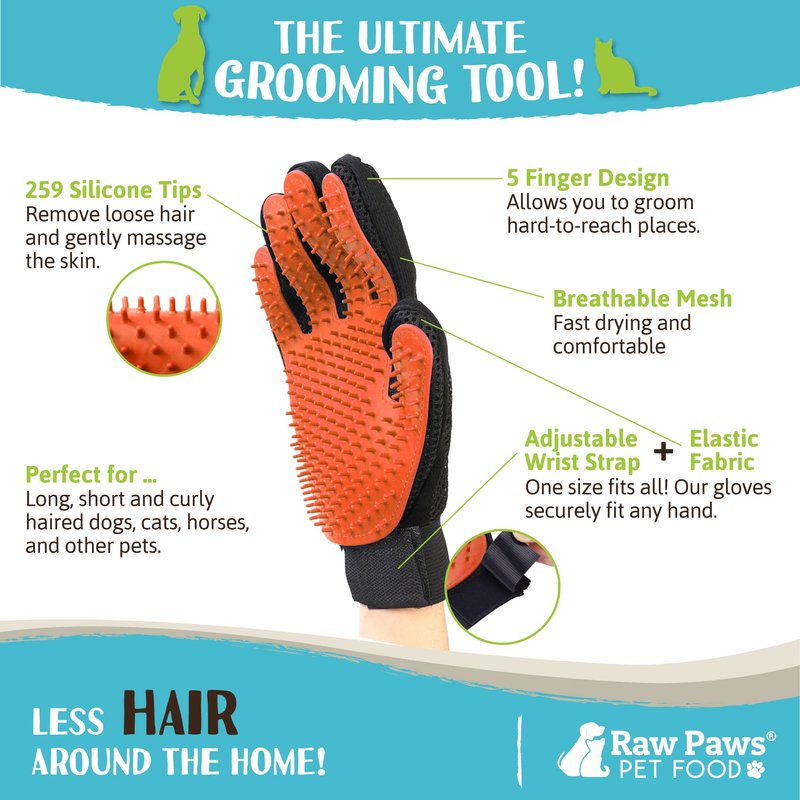 - PET GROOMING GLOVES: Raw Paws pet hair remover gloves conveniently remove excess hair and reduce shedding. So gentle and efficient, our cat glove brush just feels like a petting hand to your fur baby. Try our pet hair remover glove on dogs, cats, rabbits, ferrets or horses!